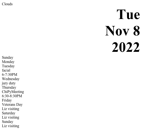 Commit Message: feat: Implement web calendar application with Flask, Docker, and calendar integration Description: 1. Server Refactor: • Moved application logic from main.py to a structured directory server/app/. • Added server/app/__init__.py for Flask app initialization. • Introduced server/app/views.py to handle routes (dashboard and dashboard_image). • Created server/app/models.py for event modeling, supporting CalDAV and iCalendar events. • Added server/app/weather.py to fetch weather data using OpenWeatherMap API. 2. New Features: • Added an image generation route (/image) to render calendar views as BMP images. • Integrated OpenWeatherMap API for weather data on the dashboard. 3. Environment and Configurations: • Added a Dockerfile to build and deploy the app using uwsgi-nginx-flask. • Introduced compose.yml for running the app with Docker Compose. • Moved uwsgi.ini configuration to server/uwsgi.ini for modular organization. 4. Dependencies: • Updated requirements.txt to include new dependencies: imgkit, pillow, and Werkzeug==2.2.2. 5. Static Assets: • Added placeholder images out.png and test.png. 6. Code Cleanup: • Removed old files (main.py and root-level uwsgi.ini). • Updated .gitignore to include .idea/ folder. Additional Notes: • Enhanced event parsing to handle all-day and time-specific events using server/app/models.py. • Utilized Flask’s render_template for dynamic HTML rendering and imgkit for HTML-to-image conversion. • Integrated multiple calendar sources (CalDAV and public iCal feeds). Let me know if you need further adjustments!